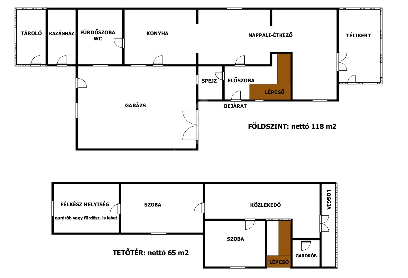 A földszint 64 m2-es lakóterében előszoba, nappali-étkező-konyha, fürdőszoba+wc és egy spejz található. A nappalihoz kapcsolódik egy udvari bejárattal is rendelkező 9 m2-es télikert.